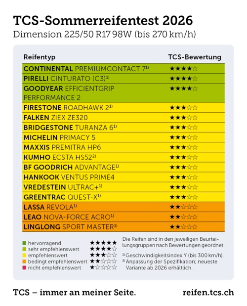 Drei Reifen erhalten im Schlussergebnis die Bewertung «sehr empfehlenswert». Der Continental PremiumContact 7, der neue Pirelli Cinturato (C3) und der Goodyear EfficientGrip Performance 2. Diese Modelle haben allesamt eine konstant hohe Leistungsfähigkeit auf allen Fahrbahnarten, ergänzt durch eine überzeugende prognostizierte Laufleistung, geringen Abrieb und eine gute Effizienz.